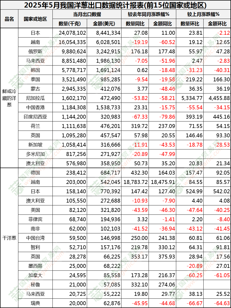 2025年5月洋蔥出口數(shù)據(jù)(按國(guó)家)