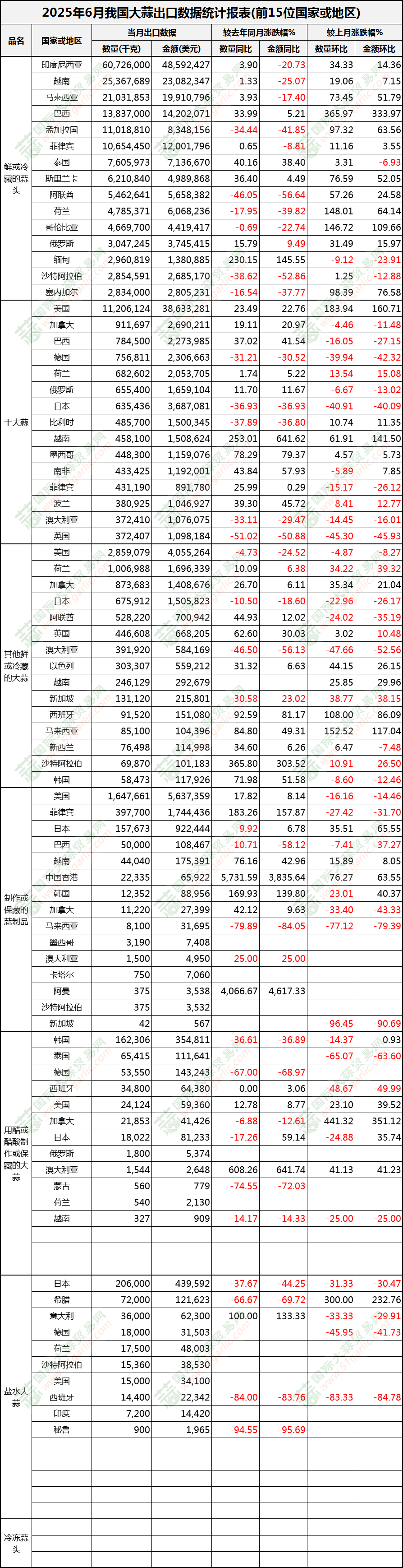 2025年6月大蒜出口數(shù)據(jù)(按國家)