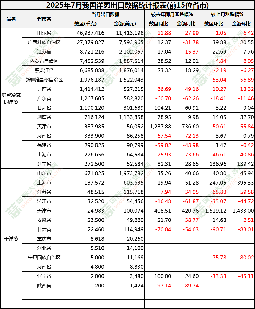 2025年7月洋蔥出口數據(按省市)