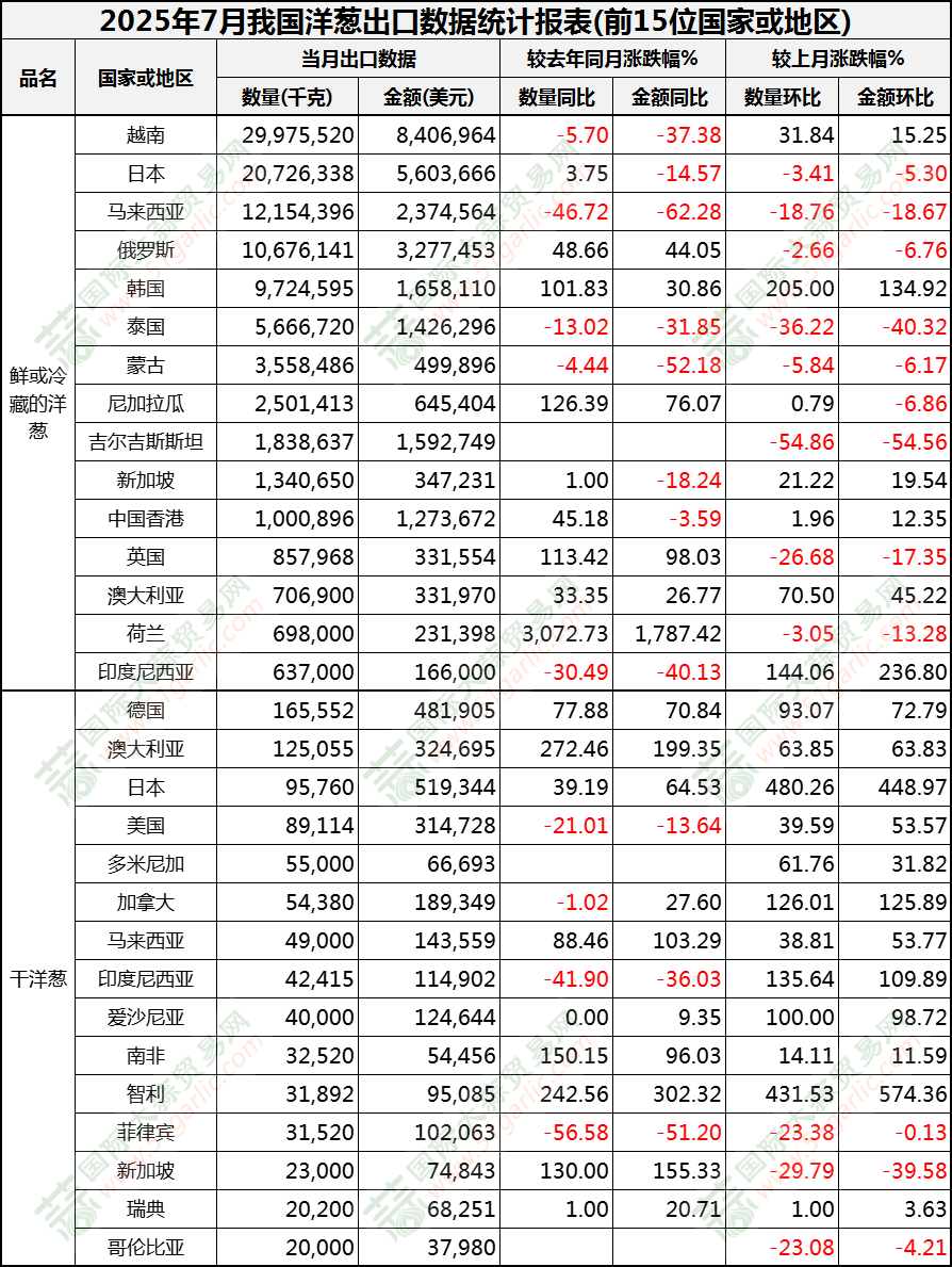 2025年7月洋蔥出口數(shù)據(jù)(按國(guó)家)