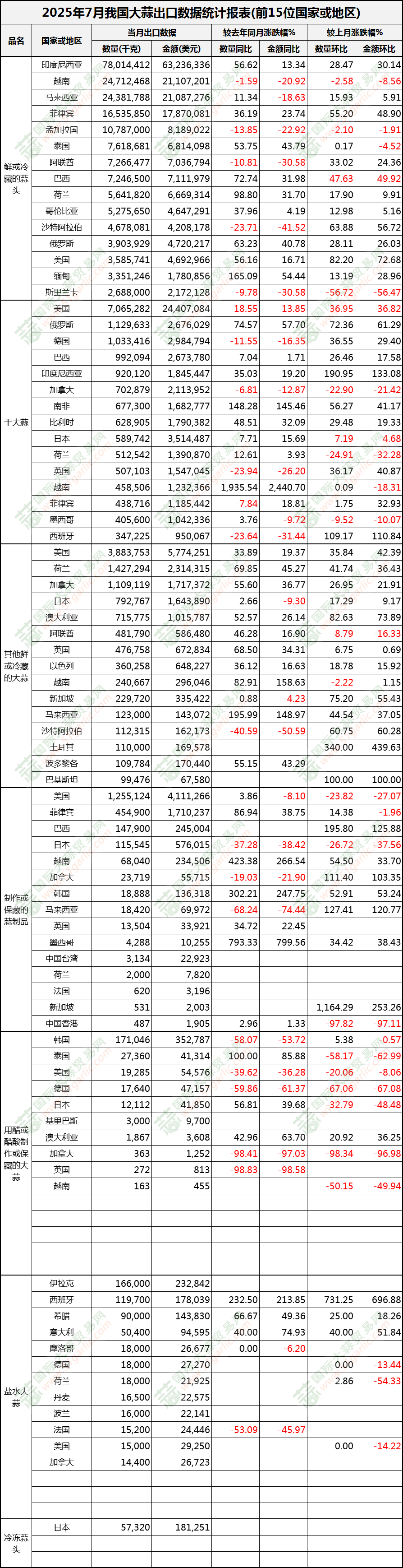 2025年7月大蒜出口數(shù)據(jù)(按國(guó)家)
