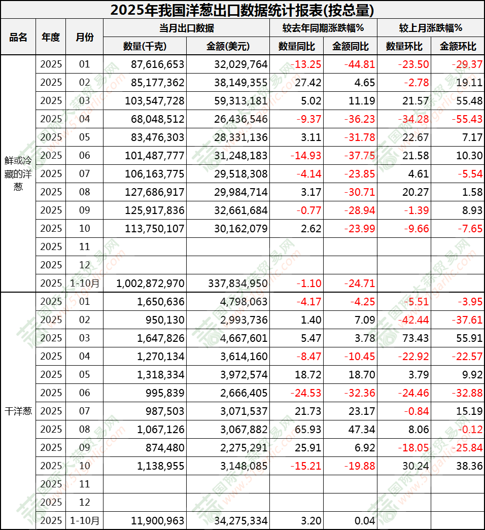 2025年10月洋蔥出口數(shù)據(jù)(按總量)